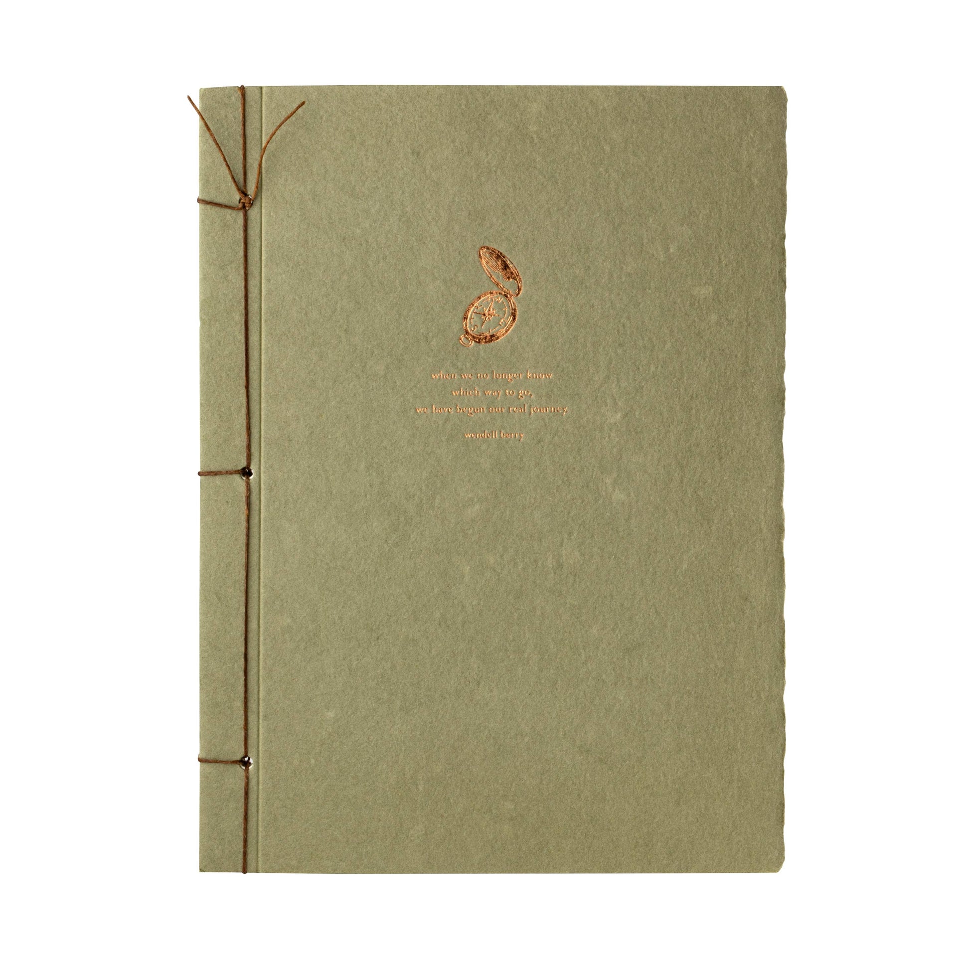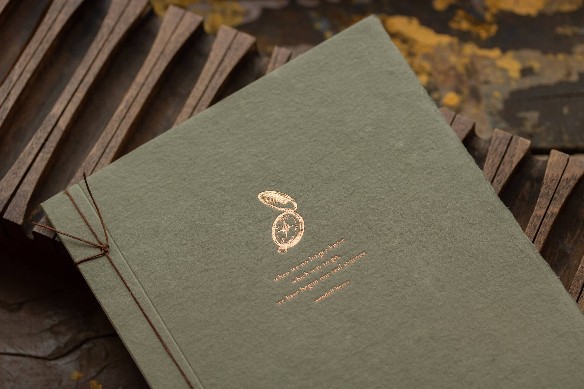 This handcrafted inspiration journal celebrates the words of poet and environmentalist Wendell Berry — a reminder that uncertainty can be the first step toward truth. Hand-bound in Portland, it features his quote letterpress printed in copper foil on olive handmade recycled cotton paper with a softly deckled edge.